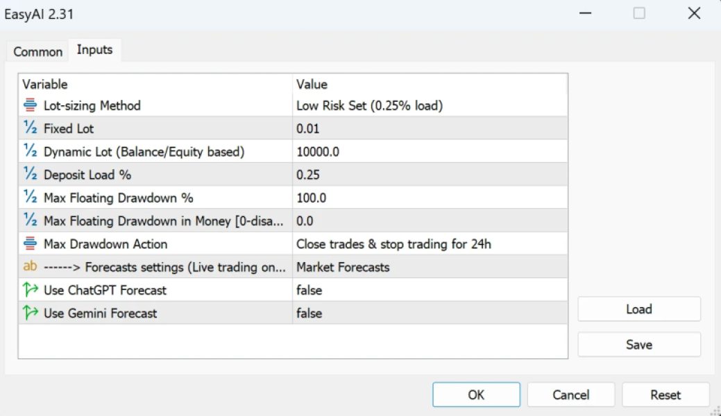 - Deposit Load %: The percentage of your deposit that will be used to open the initial trade.