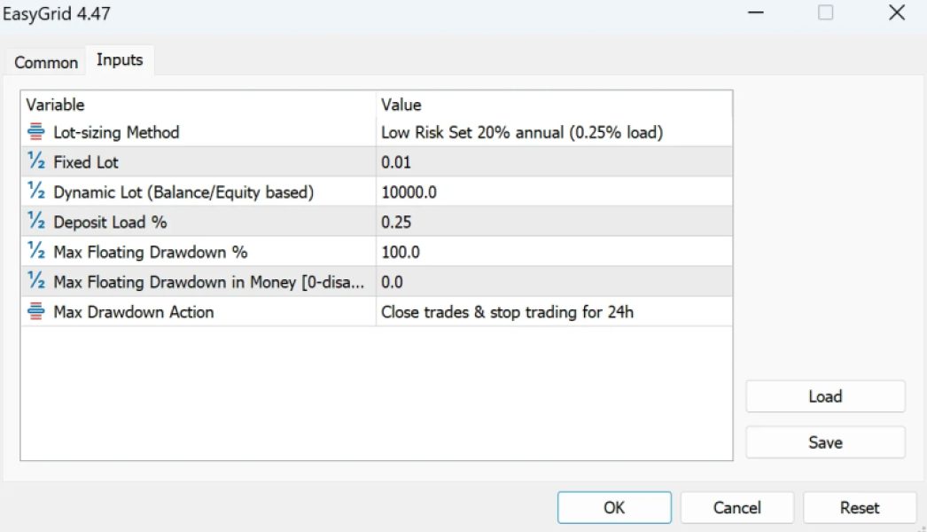 - Deposit Load %: The percentage of your deposit that will be used to open the initial trade.