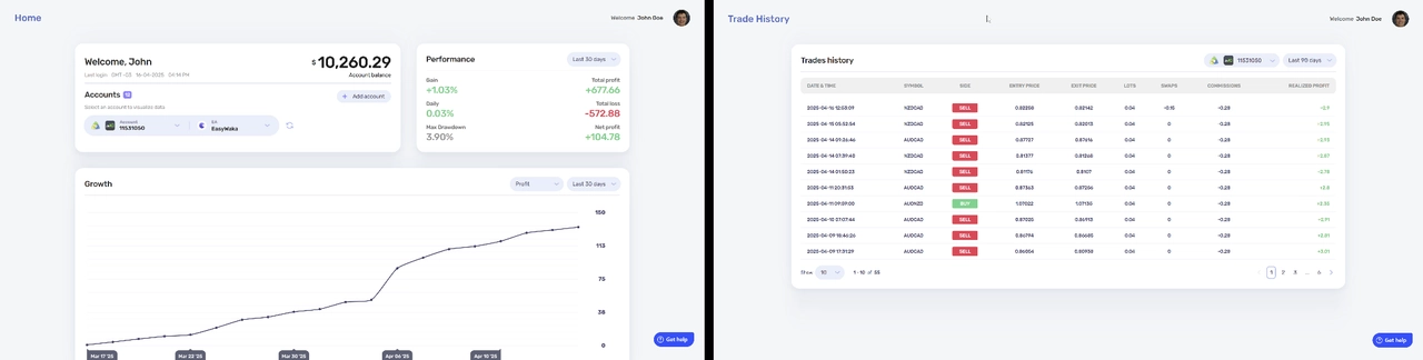 As an EasyAlgos AI user, you have access to built-in analytics and trade history tools to monitor the performance of your Expert Advisors (EAs) across all your connected accounts.