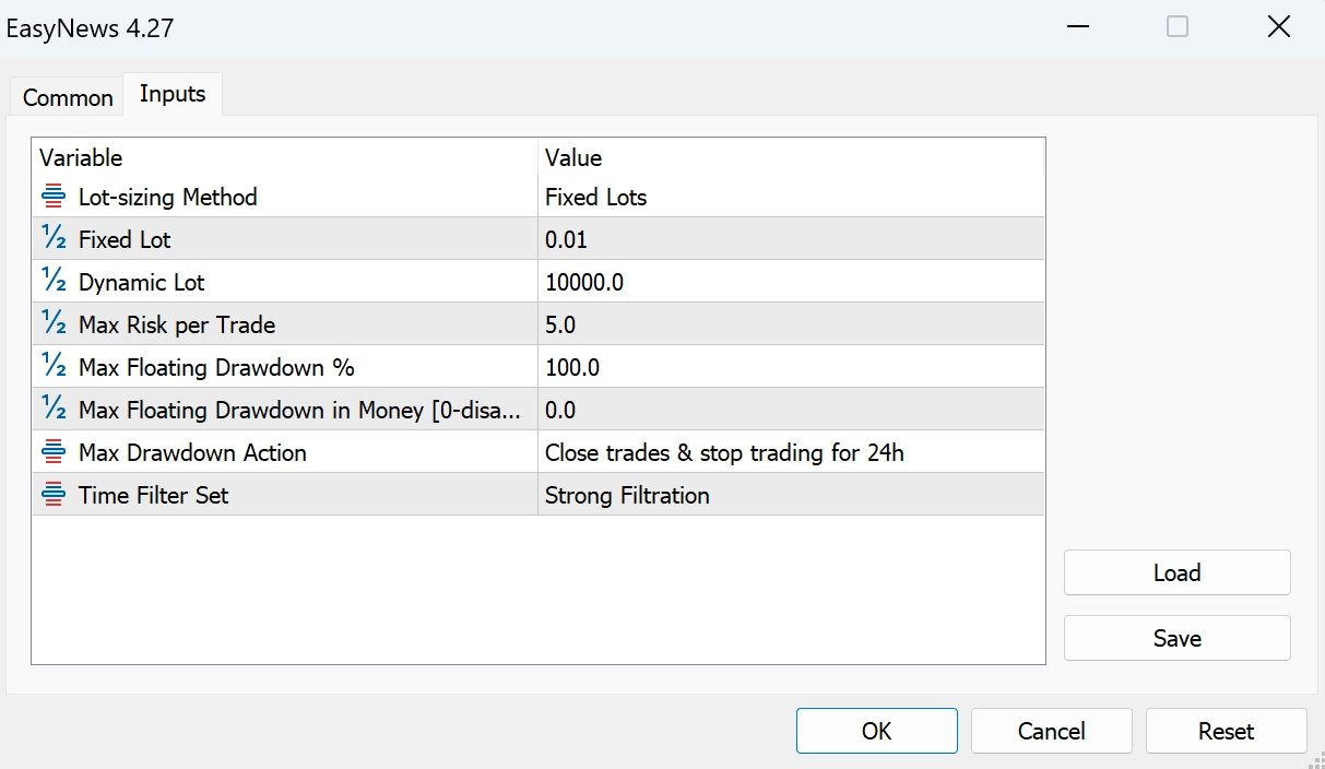 Once you load EasyNews on your chart, a pop-up box will appear displaying the settings of your EA. Make sure all the settings and alerts are configured correctly before clicking OK.