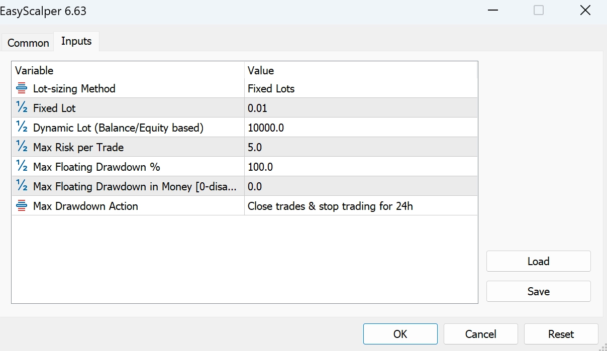 Once you load EasyScalper on your chart, a pop-up box will appear displaying the settings of your EA. Make sure that all the settings and alerts are configured correctly before clicking OK.